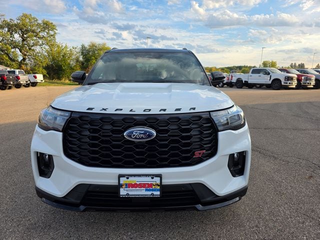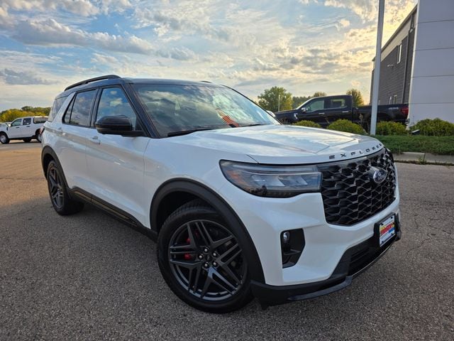 Star White Metallic Tri-Coat 2025 Ford Explorer ST 4WD 10-Speed Automatic 3.0L EcoBoost V6 Fresh Arrival, AWD / 4WD / 4X4, Trailer Hitch / Tow Package, Cruise Control, Bluetooth, Navigation System, Backup Camera, SiriusXM, Blind Spot Monitor, Heated Seats, Leather, Moonroof / Sunroof, Splash Guards, Remote Engine Start, Power Driver Seat, Rear USB Ports, 4WD, B&O Sound System by Bang & Olufsen, Equipment Group 400A Standard Package, First Aid Kit, Multicontour Seats w/Front Active Motion, Navigation System, Panoramic Vista Roof w/Power Shade, Sun and Sound Package, 10 Speakers, 3.58 Non-Limited Slip Rear Axle, 3rd row seats: bench, 4-Wheel Disc Brakes, ABS brakes, Air Conditioning, Alloy wheels, AM/FM radio: SiriusXM with 360L, Apple CarPlay/Android Auto, Auto High-beam Headlights, Auto-dimming door mirrors, Auto-dimming Rear-View mirror, Automatic temperature control, Brake assist, Bumpers: body-color, Compass, Delay-off headlights, Driver door bin, Driver vanity mirror, Dual front impact airbags, Dual front side impact airbags, Electronic Stability Control, Emergency communication system: 911 Assist, Exterior Parking Camera Rear, Four wheel independent suspension, Front anti-roll bar, Front Bucket Seats, Front Center Armrest, Front dual zone A/C, Front fog lights, Front reading lights, Fully automatic headlights, Garage door transmitter, Heated door mirrors, Heated front seats, Heated rear seats, Heated steering wheel, Heated/Ventilated Miko Sport Captain's Chairs, Illuminated entry, Knee airbag, Leather steering wheel, Low tire pressure warning, Memory seat, Occupant sensing airbag, Outside temperature display, Overhead airbag, Overhead console, Panic alarm, Passenger door bin, Passenger vanity mirror, Power door mirrors, Power driver seat, Power Liftgate, Power passenger seat, Power steering, Power windows, Radio: B&O Sound System by Bang & Olufsen, Rain sensing wipers, Rear air conditioning, Rear anti-roll bar, Rear reading lights, Rear window defroster, Rear window wiper, Remote keyless entry, Security system, Speed control, Speed-sensing steering, Speed-Sensitive Wipers, Split folding rear seat, Spoiler, Sport steering wheel, Steering wheel mounted audio controls, Tachometer, Telescoping steering wheel, Tilt steering wheel, Traction control, Trip computer, Turn signal indicator mirrors, Variably intermittent wipers, Ventilated front seats, Wheels: 21" Magnetite-Painted Aluminum, 4WD, B&O Sound System by Bang & Olufsen, Equipment Group 400A Standard Package, First Aid Kit, Multicontour Seats w/Front Active Motion, Navigation System, Panoramic Vista Roof w/Power Shade, Sun and Sound Package.