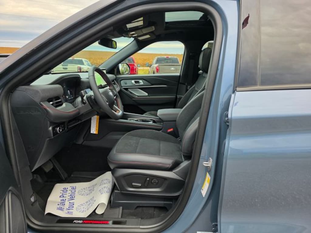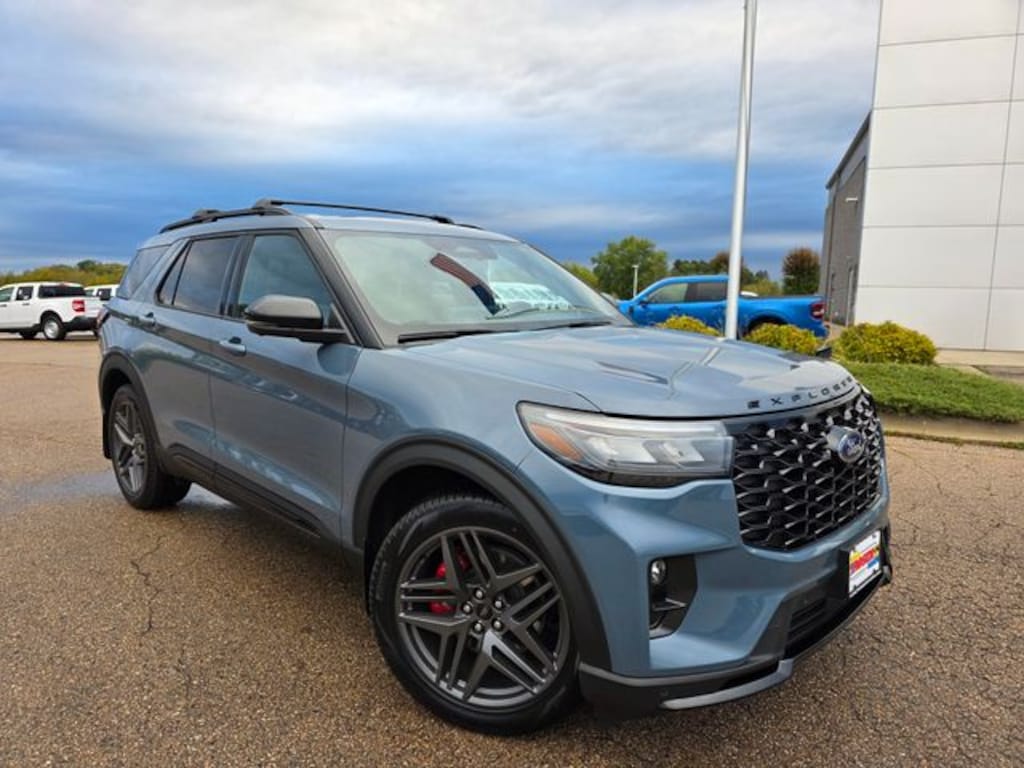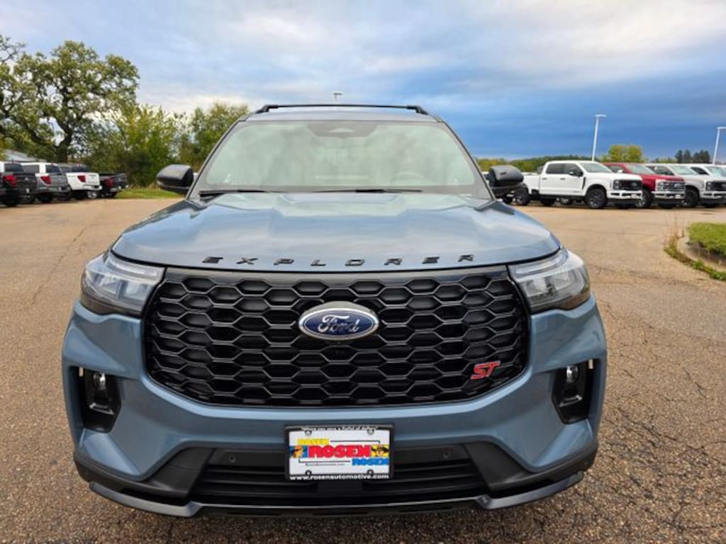 Vapor Blue Metallic 2025 Ford Explorer ST 4WD 10-Speed Automatic 3.0L EcoBoost V6 Fresh Arrival, AWD / 4WD / 4X4, Trailer Hitch / Tow Package, Cruise Control, Bluetooth, Navigation System, Backup Camera, SiriusXM, Blind Spot Monitor, Heated Seats, Leather, Moonroof / Sunroof, Splash Guards, Remote Engine Start, Power Driver Seat, Rear USB Ports, 4WD, B&O Sound System by Bang & Olufsen, Equipment Group 400A Standard Package, Multicontour Seats w/Front Active Motion, Panoramic Vista Roof w/Power Shade, Sun and Sound Package, 10 Speakers, 3.58 Non-Limited Slip Rear Axle, 3rd row seats: bench, 4-Wheel Disc Brakes, ABS brakes, Air Conditioning, Alloy wheels, AM/FM radio: SiriusXM with 360L, Apple CarPlay/Android Auto, Auto High-beam Headlights, Auto-dimming door mirrors, Auto-dimming Rear-View mirror, Automatic temperature control, Brake assist, Bumpers: body-color, Compass, Delay-off headlights, Driver door bin, Driver vanity mirror, Dual front impact airbags, Dual front side impact airbags, Electronic Stability Control, Emergency communication system: 911 Assist, Exterior Parking Camera Rear, Four wheel independent suspension, Front anti-roll bar, Front Bucket Seats, Front Center Armrest, Front dual zone A/C, Front fog lights, Front reading lights, Fully automatic headlights, Garage door transmitter, Heated door mirrors, Heated front seats, Heated rear seats, Heated steering wheel, Heated/Ventilated Miko Sport Captain's Chairs, Illuminated entry, Knee airbag, Leather steering wheel, Low tire pressure warning, Memory seat, Navigation System, Occupant sensing airbag, Outside temperature display, Overhead airbag, Overhead console, Panic alarm, Passenger door bin, Passenger vanity mirror, Power door mirrors, Power driver seat, Power Liftgate, Power passenger seat, Power steering, Power windows, Radio: B&O Sound System by Bang & Olufsen, Rain sensing wipers, Rear air conditioning, Rear anti-roll bar, Rear reading lights, Rear window defroster, Rear window wiper, Remote keyless entry, Security system, Speed control, Speed-sensing steering, Speed-Sensitive Wipers, Split folding rear seat, Spoiler, Sport steering wheel, Steering wheel mounted audio controls, Tachometer, Telescoping steering wheel, Tilt steering wheel, Traction control, Trip computer, Turn signal indicator mirrors, Variably intermittent wipers, Ventilated front seats, Wheels: 21" Magnetite-Painted Aluminum, 4WD, B&O Sound System by Bang & Olufsen, Equipment Group 400A Standard Package, Multicontour Seats w/Front Active Motion, Panoramic Vista Roof w/Power Shade, Sun and Sound Package.