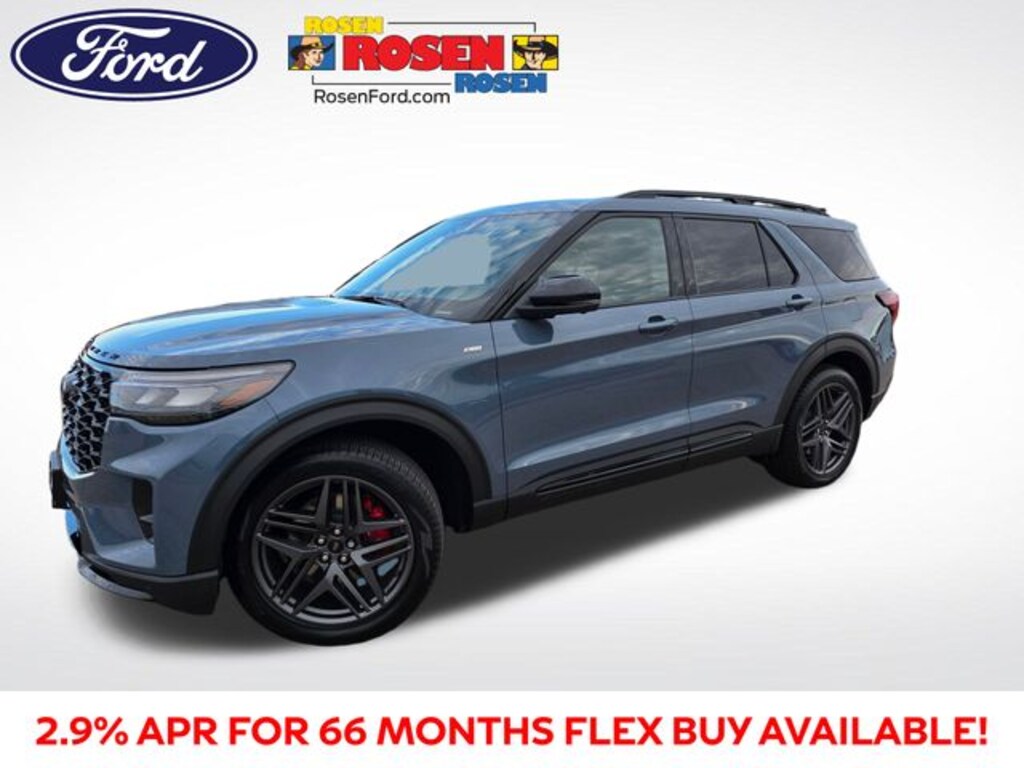 Vapor Blue Metallic 2025 Ford Explorer ST-Line 4WD 10-Speed Automatic 2.3L EcoBoost I-4 Fresh Arrival, AWD / 4WD / 4X4, Trailer Hitch / Tow Package, Cruise Control, Bluetooth, Navigation System, Backup Camera, SiriusXM, Blind Spot Monitor, Heated Seats, Moonroof / Sunroof, Remote Engine Start, Power Driver Seat, Rear USB Ports, 4WD, 110V/150W AC Power Outlet, 2nd Row Heated Seats, Ambient Lighting, Auto-Dimming Interior Rear-View Mirror, Equipment Group 300A Standard Package, Memory Driver's Seat, Navigation System, Performance Brakes, Power-Folding Sideview Mirrors w/Autofold, Premium Package, Rain-Sensing Wipers (Front Only), Red Painted Perf Front & Rear Brake Calipers, ST-Line Street Pack, Wheels: 21" Magnetite-Painted Aluminum, Wireless Charging Pad, 10 Speakers, 3.58 Non-Limited Slip Rear Axle, 3rd row seats: bench, 4-Wheel Disc Brakes, ABS brakes, Air Conditioning, Alloy wheels, AM/FM radio: SiriusXM with 360L, Apple CarPlay/Android Auto, Auto High-beam Headlights, Automatic temperature control, Brake assist, Bumpers: body-color, Compass, Delay-off headlights, Driver door bin, Driver vanity mirror, Dual front impact airbags, Dual front side impact airbags, Electronic Stability Control, Emergency communication system: 911 Assist, Exterior Parking Camera Rear, Four wheel independent suspension, Front anti-roll bar, Front Bucket Seats, Front Center Armrest, Front dual zone A/C, Front fog lights, Front reading lights, Fully automatic headlights, Garage door transmitter, Heated door mirrors, Heated front seats, Heated steering wheel, Heated Unique Cloth Captain's Chairs, Illuminated entry, Knee airbag, Leather steering wheel, Low tire pressure warning, Occupant sensing airbag, Outside temperature display, Overhead airbag, Overhead console, Panic alarm, Passenger door bin, Passenger vanity mirror, Power door mirrors, Power driver seat, Power Liftgate, Power passenger seat, Power steering, Power windows, Radio: B&O Sound System by Bang & Olufsen, Rear air conditioning, Rear anti-roll bar, Rear reading lights, Rear window defroster, Rear window wiper, Remote keyless entry, Security system, Speed control, Speed-sensing steering, Speed-Sensitive Wipers, Split folding rear seat, Spoiler, Steering wheel mounted audio controls, Tachometer, Telescoping steering wheel, Tilt steering wheel, Traction control, Trip computer, Variably intermittent wipers, Wheels: 20" Ebony-Painted Machined Aluminum, 4WD, 110V/150W AC Power Outlet, 2nd Row Heated Seats, Ambient Lighting, Auto-Dimming Interior Rear-View Mirror, Equipment Group 300A Standard Package, Memory Driver's Seat, Navigation System, Performance Brakes, Power-Folding Sideview Mirrors w/Autofold, Premium Package, Rain-Sensing Wipers (Front Only), Red Painted Perf Front & Rear Brake Calipers, ST-Line Street Pack, Wheels: 21" Magnetite-Painted Aluminum, Wireless Charging Pad.