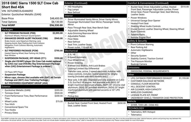 New Price! Quicksilver Metallic 2018 GMC Sierra 1500 SLT 4WD 6-Speed Automatic Electronic with Overdrive EcoTec3 5.3L V8 Fresh Arrival, Clean Vehicle History, Trailer Hitch / Tow Package, Cruise Control, Bluetooth, Backup Camera, SiriusXM, Heated Seats, Remote Engine Start, Power Driver Seat, 6-Speed Automatic Electronic with Overdrive, 4WD, Dark Ash Seats With Jet Black Interior Accents Leather, 110-Volt AC Power Outlet, 150 Amp Alternator, 1st & 2nd Row Color-Keyed Carpeted Floor Mats, 2-Speed Active Electronic AutoTrac Transfer Case, 20" x 9" Polished Aluminum Wheels, 4.2" Diagonal Color Display Driver Info Center, 6" Rectangular Chromed Tubular Assist Steps, Auto-Dimming Inside Rear-View Mirror, Auxiliary External Transmission Oil Cooler, Bose Speaker System, Chrome Bodyside Moldings, Chrome Door Handles, Chrome Mirror Caps, Color-Keyed Carpeting, Deep-Tinted Glass, Driver & Front Passenger Illuminated Vanity Mirrors, Dual-Zone Automatic Climate Control, Electric Rear-Window Defogger, Enhanced Driver Alert Package, EZ Lift & Lower Tailgate, Forward Collision Alert, Front Frame-Mounted Black Recovery Hooks, GMC 4G LTE, GMC Connected Access, Heavy-Duty Rear Locking Differential, Hill Descent Control, IntelliBeam Automatic High Beam On/Off Headlight, Lane Keep Assist, Leather Wrapped Heated Steering Wheel, Leather Wrapped Steering Wheel w/Cruise Controls, LED Cargo Box Lighting, LED Tailamps w/Signature, Low Speed Forward Automatic Braking, Manual Tilt/Telescoping Steering Column, Off-Road Suspension Package, OnStar & GMC Connected Services Capable, Power Adjustable Pedals, Power Folding & Adjustable Heated Outside Mirrors, Power Sliding Rear Window w/Defogger, Power Windows w/Driver Express Up & Down, Preferred Equipment Group 4SA, Rear 60/40 Folding Bench Seat (Folds Up), Rear Wheelhouse Liners, Remote Keyless Entry, Remote Locking Tailgate, Remote Vehicle Starter System, Single Slot CD/MP3 Player, SLT Preferred Package, SLT Premium Package, Steering Wheel Audio Controls, Theft Deterrent System (Unauthorized Entry), Thin Profile LED Fog Lamps, Trailering Equipment, Ultrasonic Front & Rear Park Assist, Universal Home Remote, 10-Way Power Driver's Seat Adjuster, 4-Wheel Disc Brakes, 40/20/40 Front Split Bench Seat, 6 Speakers, 6-Speaker Audio System, ABS brakes, Adjustable pedals, Air Conditioning, Alloy wheels, AM/FM radio: SiriusXM, Auto-dimming door mirrors, Auto-dimming Rear-View mirror, Automatic temperature control, Bodyside moldings, Brake assist, Bumpers: chrome, Cat-Back Performance Exhaust (LPO), CD player, Compass, Delay-off headlights, Driver door bin, Driver vanity mirror, Dual front impact airbags, Dual front side impact airbags, Electronic Stability Control, Exterior Parking Camera Rear, Floor Mounted Console, Front anti-roll bar, Front Center Armrest w/Storage, Front dual zone A/C, Front fog lights, Front Full Feature Power Reclining Bucket Seats, Front License Plate Kit, Front reading lights, Front wheel independent suspension, Fully automatic headlights, Garage door transmitter, Hard Tri-Folding Vinyl Tonneau Cover, HD Radio, Heated & Ventilated Front Bucket Seats, Heated door mirrors, Heated Driver & Front Passenger Seats, Heated front seats, Heavy Duty Suspension, High-Intensity Discharge Headlights, Illuminated entry, Leather Appointed Seat Trim, Low tire pressure warning, Memory seat, Occupant sensing airbag, Outside temperature display, Overhead airbag, Overhead console, Panic alarm, Passenger door bin, Passenger vanity mirror, Power door mirrors, Power driver seat, Power passenger seat, Power steering, Power windows, Premium audio system: GMC Infotainment System, Radio data system, Radio: AM/FM/GMC Infotainment System, Rear reading lights, Rear seat center armrest, Rear step bumper, Rear window defroster, Remote keyless entry, Security system, SiriusXM Satellite Radio, Speed control, Speed-sensing steering, Split folding rear seat, Steering wheel mounted audio controls, Tachometer, Telescoping steering